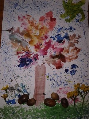 To również zabawa plastyczna. Podkładamy listki pod kartkę papieru i kolorujemy po nich kredkami. W ten sposób powstają piękne odbicia w kształcie listków z odtworzonym zarysem i żyłkami. Możemy narysować piękne, jesienne drzewo czy bukiet w wazonie.