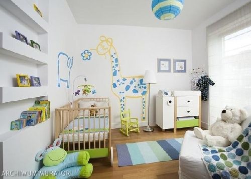 Bardzo przydatnymi do urządzenia pokoju niemowlęcego będą tapety z motywami dziecięcymi lub gotowe naklejki na ścianę. W dobie dzisiejszych trendów unikamy malowania ścian na biało, jednakże dla tych rodziców, którzy nie chcą nadawać jednoznacznego wyrazu kolorystycznego pokoikowi polecam pomalowanie ścian farbą w odcieniu np. kości słoniowej i naklejenie aplikacji w różnych kształtach np. kolorowych zwierzątek.